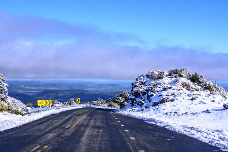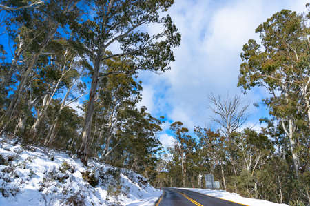 Australian road covered with snow with green eucalyptus trees on sides. Snow in Australia, rare unusual weather event concept