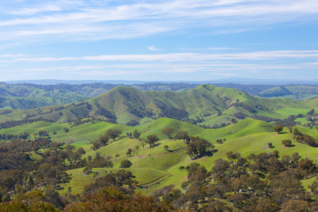 Discover the enchanting beauty of rolling hills adorned with vibrant green grass and surrounded by majestic mountains, creating a tranquil outdoor landscape.