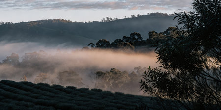 Rain mist and low cloud over gum trees in a valley in rural New South Wales in Australia.