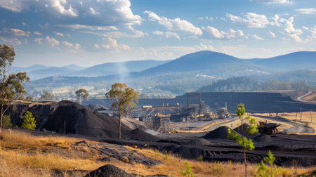 Heavy machinery operating in a vast open pit mine, transforming the landscape against a backdrop of majestic mountains