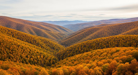 A serene landscape of rolling hills and mountains covered in lush green forests under a blue sky