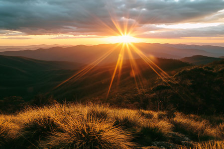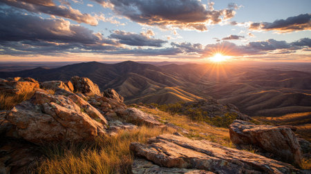 Experience the tranquility of a stunning sunset over rugged mountains, where sunlight filters through dramatic clouds, illuminating rolling hills and rocky terrain.