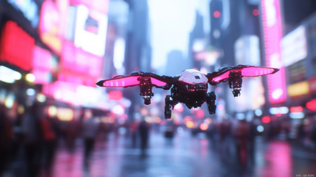 A futuristic flying machine is hovering over a city. The city is lit up with lights, giving the scene a futuristic and technological vibe