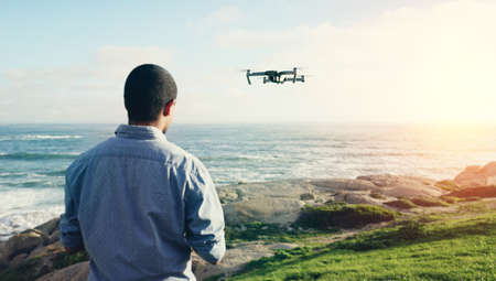 The world is his playground. Rearview shot of a young man flying his drone outdoors.