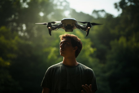 The picture of the professional drone photographer holding the drone that has been surrounded with nature landscape under sunlight, the drone photographer require much experience with drone. AIG43.