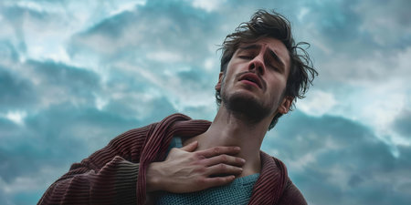 Portrait of a man in his s experiencing chest pain from GERD, dressed in a cardigan against a cloudy sky in group photo. Concept Medical Condition, Chest Pain, GERD, Men's Fashion, Group Photoshoot