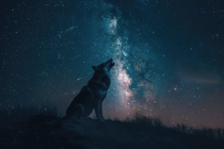 A lone wolf howls under a vibrant star filled sky in a serene natural setting.