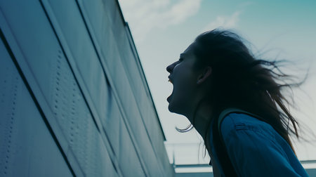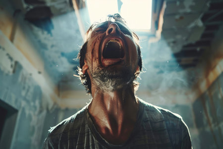 A man stands in an empty industrial area, his face contorted in a scream of anger. Dramatic lighting casts deep shadows as the sun sets, enhancing the emotional intensity of the moment.
