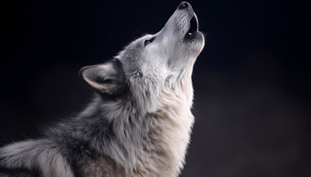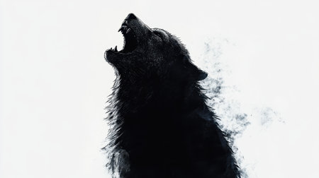 A majestic black wolf is captured mid-howl, its silhouette starkly contrasted against a brilliant white background. The artwork emphasizes the wolf's strength, spirit, and connection to the wild, evoking a sense of freedom and mystery.