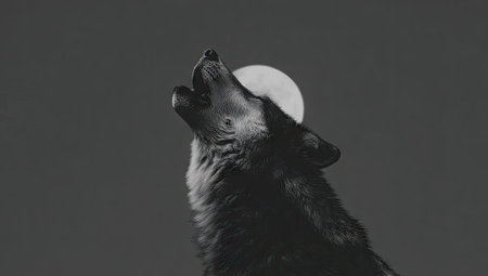 Grayscale image of a wolf howling at the full moon. The wolf is positioned in profile view, with its mouth open in a howl. The background is a dark, gray sky with a prominent full moon.