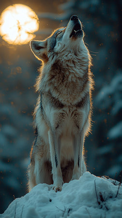 A wolf with thick fur howls upwards, silhouetted against a glowing moon and snowy landscape.