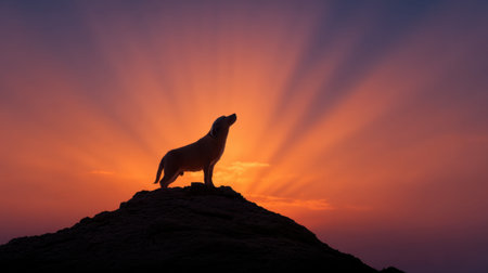 Enjoy the captivating silhouette of a majestic dog standing atop a rocky outcrop against a stunning vivid sunset, with divine rays illuminating the tranquil landscape.
