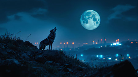 Lone wolf howling at full moon in illuminated cityscape at night.