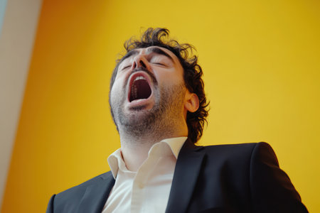 Exhausted corporate man yawns during work. Fatigue, overwork, and lack of energy in daily business environment.