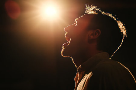 Side profile of passionate speaker illuminated by spotlight, expressing emotion and power during an impactful public performance.