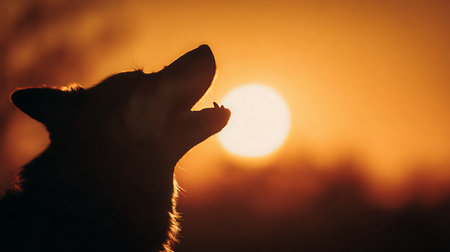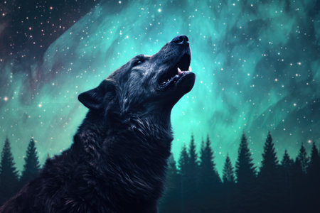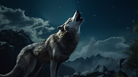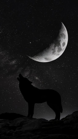 A majestic silhouette of a wolf howling at a bright full moon dominates a serene night sky filled with stars. This atmospheric image captures the essence of wilderness and tranquility.