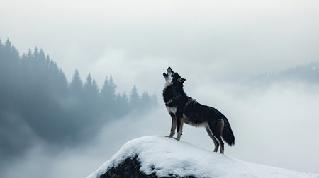 A wolf stands majestically on a snowy rock, howling into a misty landscape filled with evergreen trees, embodying the spirit of the wild.