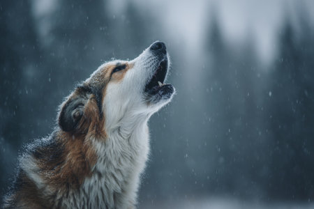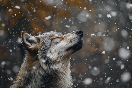 A wolf stands in the snow, raising its head to howl into the cold winter air. Snowflakes fall gently around, creating a serene and quiet atmosphere in the forested landscape.