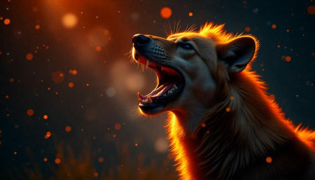 Wolf howls under vibrant blue and red lights in a mystical atmosphere at night