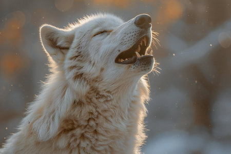 Close-up profile of a white wolf, its mouth open in a howl, against a snowy background. The animal's fur appears thick and fluffy, the lighting soft and muted, creating a sense of serene isolation in the snowy scene.