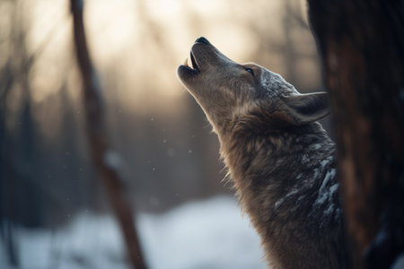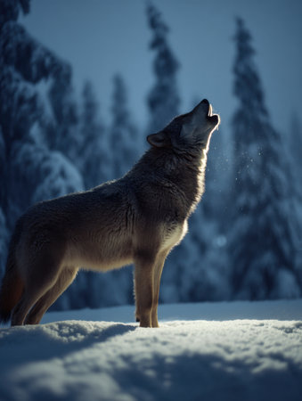 A stunning image of a wolf howling in a snowy forest. The moonlight casts a soft glow, highlighting the wolf's silhouette against the tranquil winter landscape.