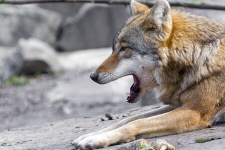A North American Wolf (Canis lupus) resting in the dry grass in front of the forest. Calm, black and big North American wolf male. Open mouth.