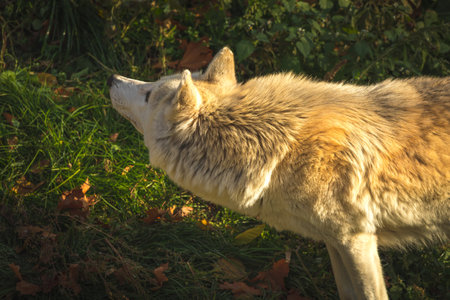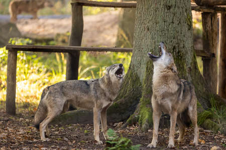 Two wolves howling in a natural reserve in Hesse, Germany at a sunny morning in autumn.