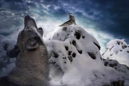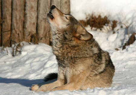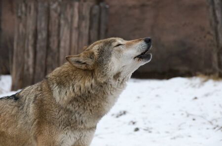 Half body of wolf on snow in winter. Recorded in Moscow zoo.