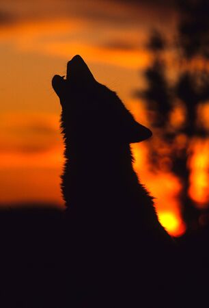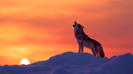 A lone wolf silhouetted against a vibrant sunset, howling at the sky.