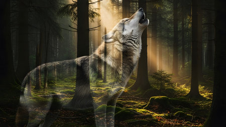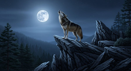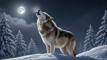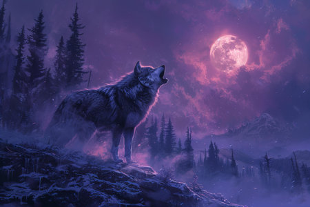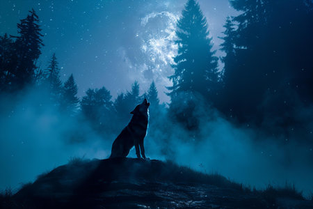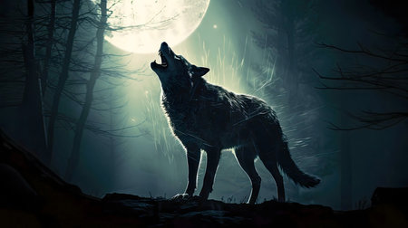 A lone wolf howls at the full moon in a dark forest. A serene and mystical scene.