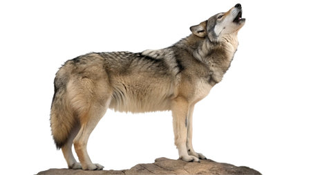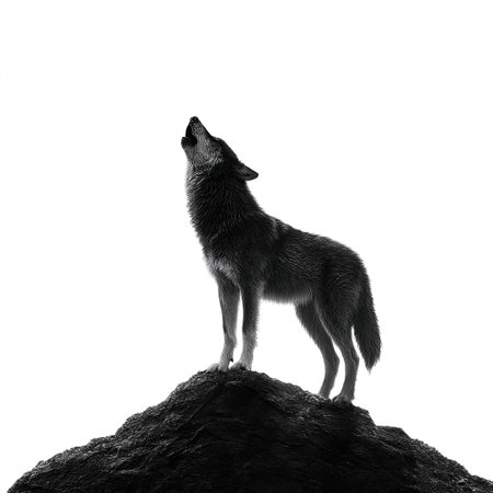 A lone wolf stands on a rock, howling at a full moon shining brightly in a dark sky.