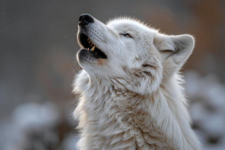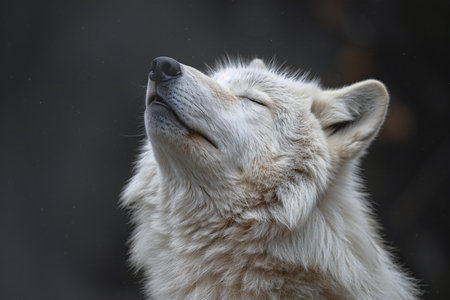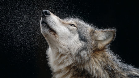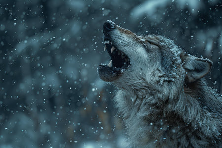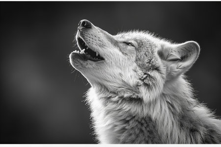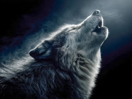 A powerful gray wolf releases a haunting call under a starless sky, its breath visible in the crisp air, embodied wildness and the untamed spirit of nature.
