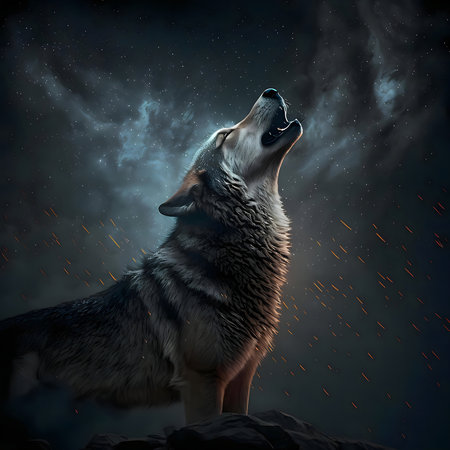A majestic wolf howls at the night sky, filled with stars and shooting stars. Digital art.