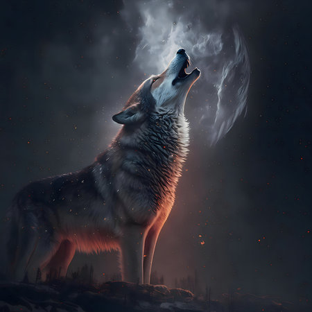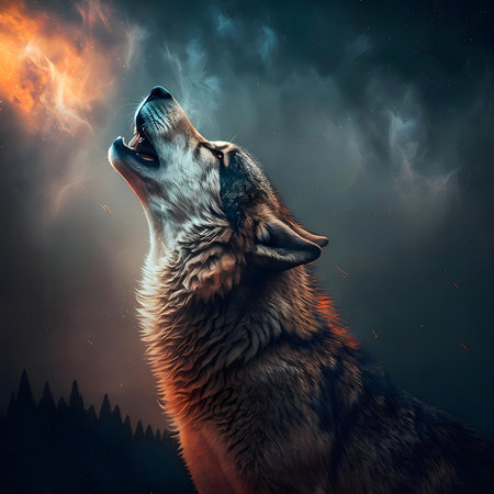 A lone wolf howls at the night sky, a fiery spectacle painting the clouds above