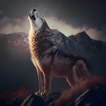 A lone wolf howls at the moon under a starry night sky, majestic mountains forming a dramatic backdrop.