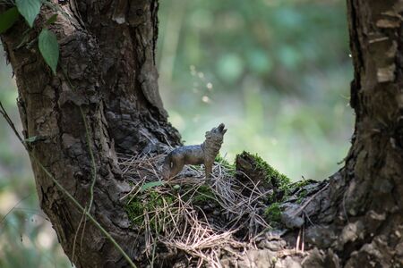 Howling wolf in the forest. Mini wolf figure. Wild animal concept. Selective focus