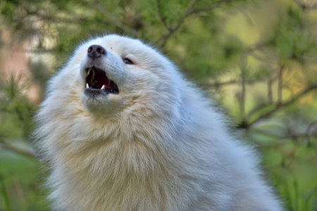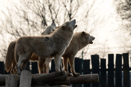 A group of white wolves in a zoo, a white predator, howling wolves.