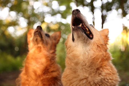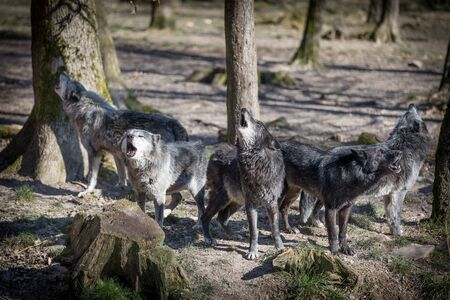 Two wolves howling in a natural reserve in Hesse, Germany at a sunny morning in autumn.