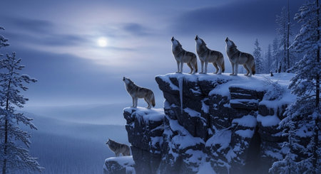 A regal wolf stands tall beneath a luminous moon, piercing the dark with a haunting howl as swirling mist weaves through the wilderness, evoking mystery and strength
