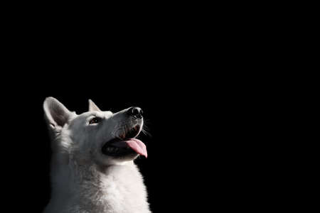 Portrait of beuatiful dog isolated on black studio background in pink neon light. Concept of beauty, domestic animal.
