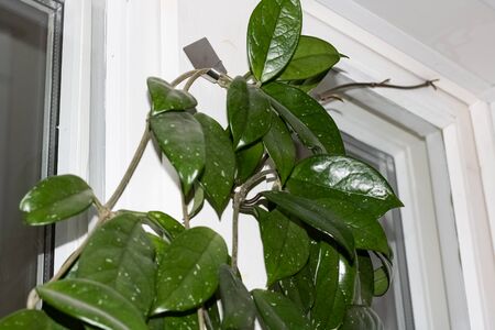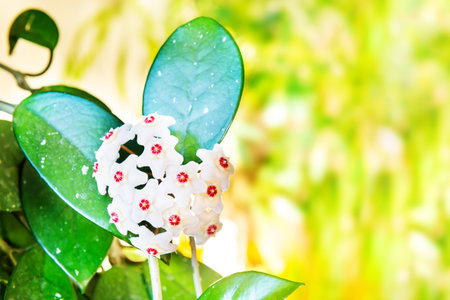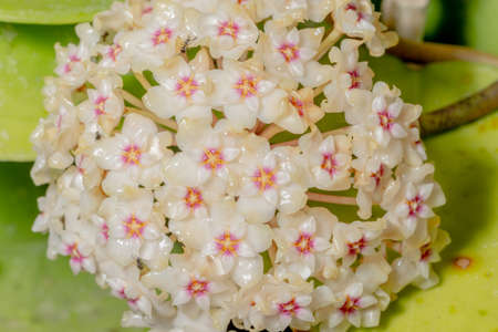 White flowers on green house plant. Hoya carnosa blooming, bunch of flowers on green leaves