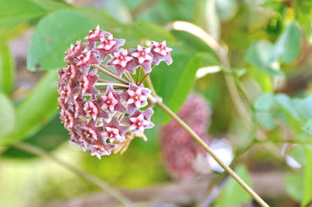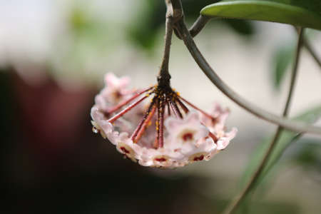 Star shape flower, Hoya Carnosa, also known as porcelain flower or wax plant. Macro photo on the branch of flower.