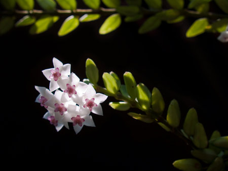 A detailed close-up captures a cluster of delicate Hoya flowers, their creamy white petals and pinkish centers highlighted against a stark black backdrop. The image showcases the intricate details of the blossoms and their arrangement.