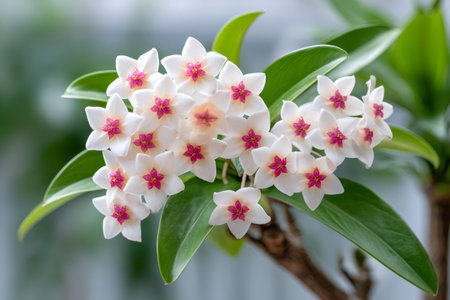 Hoya flowers with white petals and pink centers blooming as a cluster