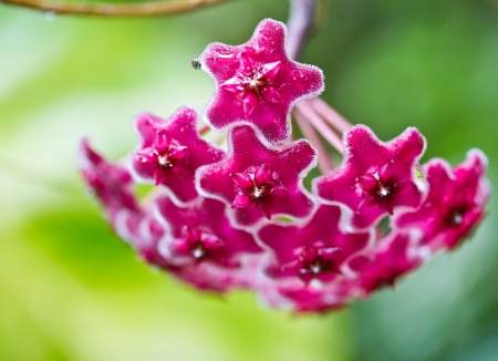 Pink hoya flowers on green background.