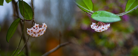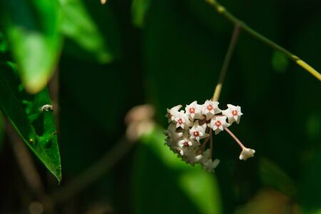 Beautiful delicate flowers Hoya wax ivy, among the leaves.