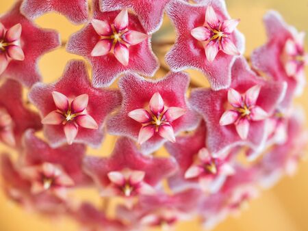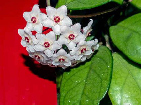 Red Hoya carnosa flowers star shape is blooming, close up. Home floriculture concept, Hoya breeding.