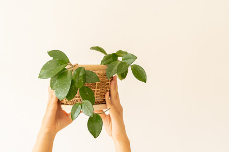 Hands holding indoor plant in green pot on neutral light background. Indoor gardening, eco hobby, love of plants