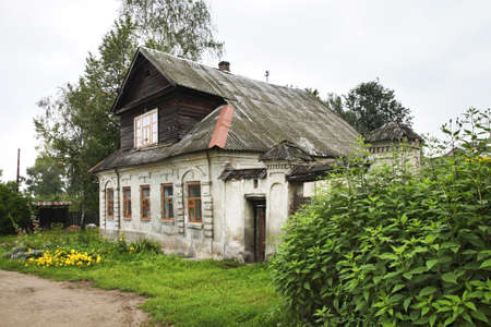 Rural wooden houses in russian village in summer sunny day. Novgorod region, Russia