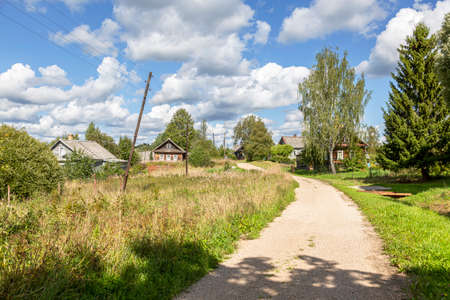 Rural landscape. Country road in a village with houses and vegetable gardens on a summer day.